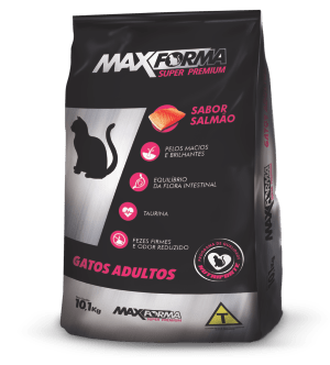 MAXFORMA é um alimento SUPER PREMIUM especialmente desenvolvido para atender todas as necessidades de GATOS ADULTOS, formulada com ingredientes nobres e rigorosamente selecionados, proporcionando para seu felino: saúde, vitalidade e um sabor irresistível de salmão.