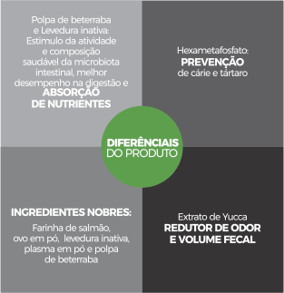 Farinha de salmão, ovo desidratado em pó, levedura, plasma em pó, farinha de vísceras, polpa de beterraba, farinha de carne e osso, milho integral (**transgênico), farelo de trigo, farelo de soja, (**transgênico), quirera de arroz, hidrolisado de frango, óleo de frango, óleo de peixe, yucca, icamitina, vitaminas B1, B2, B6, B12, vitamina C, inositol, niacina, pantotenato de cálcio, folacina, biotina, cloreto de potássio, óxido de magnésio, óxido de zinco, óxido de manganês, sulfato de cobre, sulfato de ferro, sulfato de cobalto, selenito de sódio, iodato de cálcio, antioxidante, hexametafosfato, immunowall (mos & B-glucanos), starfix (adsorvente de microtoxinas).