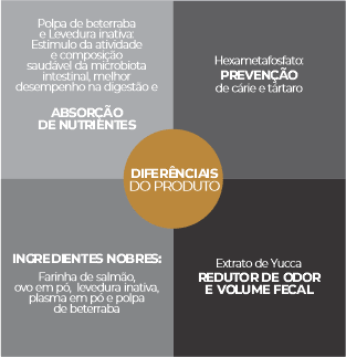 Farinha de salmão, ovo desidratado em pó, levedura, plasma em pó, farinha de vísceras, polpa de beterraba, farinha de carne e osso, milho integral (**transgênico), farelo de trigo, farelo de soja, (**transgênico), quirera de arroz, hidrolisado de frango, óleo de frango, óleo de peixe, yucca, icamitina, vitaminas B1, B2, B6, B12, vitamina C, inositol, niacina, pantotenato de cálcio, folacina, biotina, cloreto de potássio, óxido de magnésio, óxido de zinco, óxido de manganês, sulfato de cobre, sulfato de ferro, sulfato de cobalto, selenito de sódio, iodato de cálcio, antioxidante, hexametafosfato, immunowall (mos & B-glucanos), starfix (adsorvente de microtoxinas).