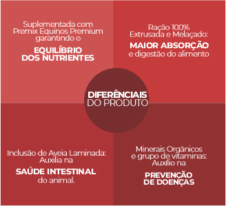 Alimento completo e EXTRUSADO, balanceado por Zootecnista, com partículas banhadas em MELAÇO, e inclusão de AVEIA LAMINADA, para atender as necessidades de Equinos em trabalhos moderados. Contém também vitaminas do complexo B e minerais orgânicos que previnem doenças e auxiliam o organismo a melhores aproveitamentos e equilíbrio nutricional do seu animal.