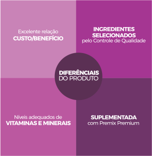 Farinha de carne e ossos, farinha de vísceras, farelo de trigo, farelo de soja(*transgênico), milho integral (**transgênico), hidrolisado de frango, gordura animal, vit. A, vit. D3, vit. E, vit. K3, cloreto de colina, vit. B1, vit. B2, vit. B6, vit. B12, vit. C, inositol, niacina, pantontenato de cálcio, folacina, biotina, cloreto de potássio, óxido de magnésio, óxido de zinco, óxido de manganês, sulfato de cobre, sulfato de ferro, sulfato de cobalto, selenito de sódio, iodato de cálcio, antioxidante