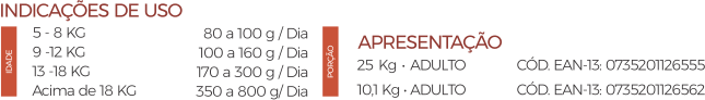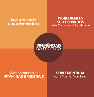 Farinha de carne e ossos, farelo de arroz farinha de vísceras, farelo de trigo, milho integral (*transgênico), farelo de soja (** transgênico),, hidrolisado de frango, gordura animal, vitamina A, vitamina D3, vitamina E, vitamina K3, cloreto de colina, vitamina B1, vitamina B2, vitamina B6, vitamina B12, vitamina C, inositol, niacina, pantotenato de cálcio, folacina, biotina, cloreto de potássio, óxido de magnésio, óxido de zinco, óxido de manganês, sulfato de cobre, sulfato de ferro, sulfato de cobalto, selenito de sódio, iodato de cálcio, antioxidante.