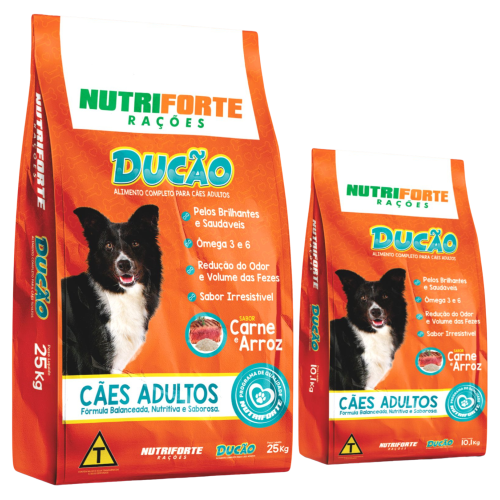 Ducão é um alimento seco completo especialmente desenvolvido para atender todas as necessidades de cães adultos em atividades moderadas, formulada com ingredientes rigorosamente selecionados proporcionando para o seu companheiro: saúde, vitalidade e um sabor irresistível de carne e arroz